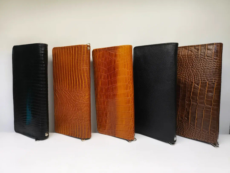 جنس:چرم گاوی رنگ:مشکی(فلوتر،کروکودیلی)، قهوه ای(کروکودیلی،لزار)، عسلی (لزار، کروکودیلی، فلوتر)، دسترنگ لزار جیب:یک جای مخصوص دسته چک، چهار محفظه جای پول، ۱۷ جای کارت بانکی جداگانه، 2جای کارت شناسایی، یک هولدر خودکار سایز: ۲۴*12 همراه با یک بند مچی