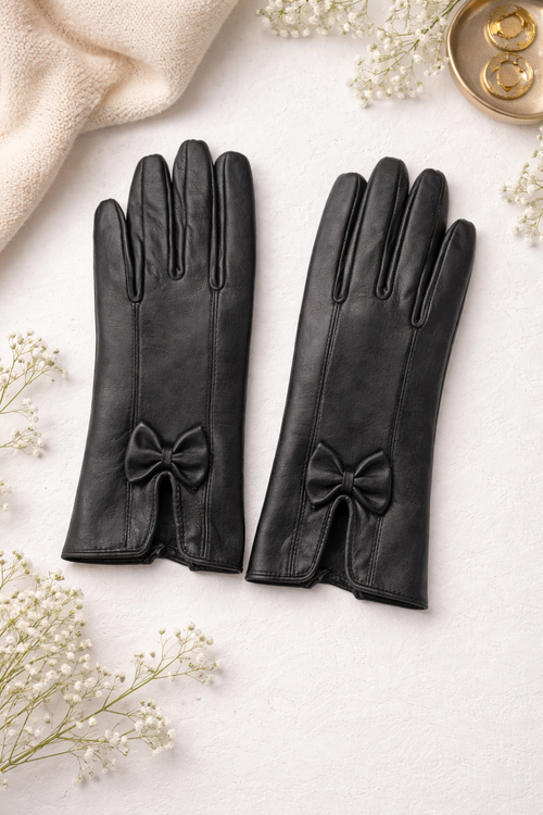 دستکش چرم طبیعی زنانه مدل پاپیوندار – رنگ مشکی کلاسیک