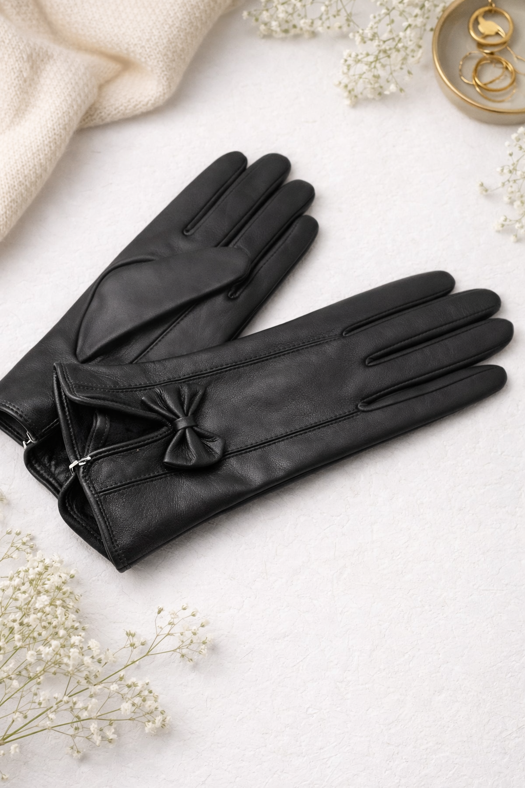 دستکش چرم طبیعی زنانه مدل پاپیوندار – رنگ مشکی کلاسیک